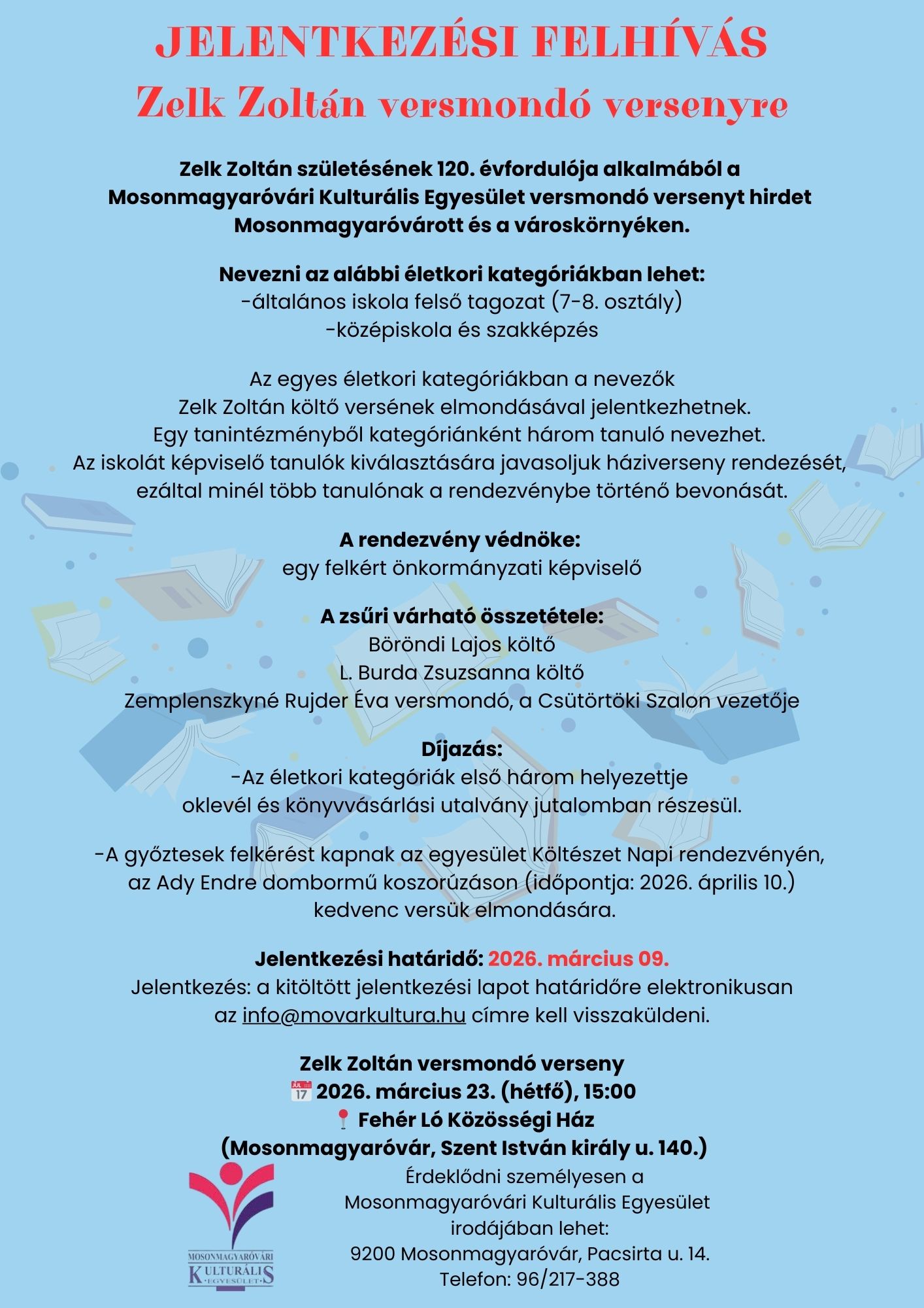 Zelk Zoltán születésének 120. évfordulója alkalmából a Mosonmagyaróvári Kulturális Egyesület versmondó versenyt hirdet Mosonmagyaróvárott és a városkörnyéken.